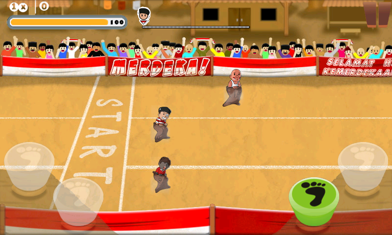 Siapa yang tidak tahu permainan balap karung. Sebagian orang pasti pernah melihat atau bahkan ikut serta dalam lomba ini. Game balap karung ini sangat mudah dimainkan, sobat hanya perlu menekannya satu tumbol untuk membuat karakter sobat melompat dan menang dalam pertandingan.